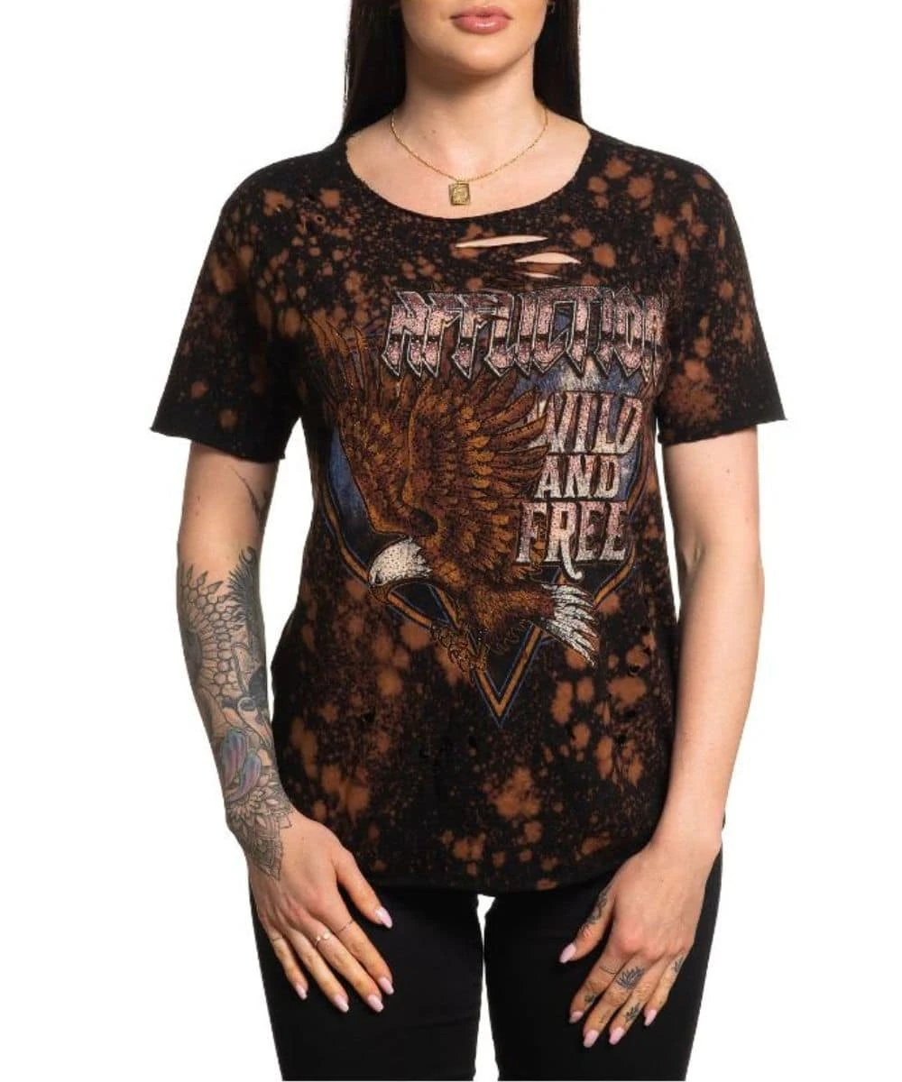 100% Cotton; Color: Black Acid Pebble Wash; Scoop Neck; Laser Cuts At Neckline; Rhinestone Accented Graphic; Front Graphic Displays Flying Eagle With Words ‘AFFLICTION WILD AND FREE’; Short Sleeve; Style #AW24626