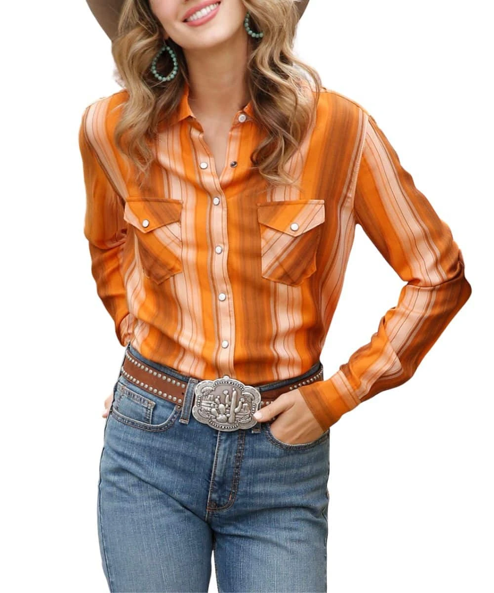 Yarn Dyed Striped Rayon; Boyfriend Fit; Long Sleeve; Spread Collar; Full Front Snap Closure And Cuffs; White Marble Snaps; Dual Single Point Snap Flap Chest Pockets; Logo Embroidery; Color: Orange Stripes; Style #CTW7439001