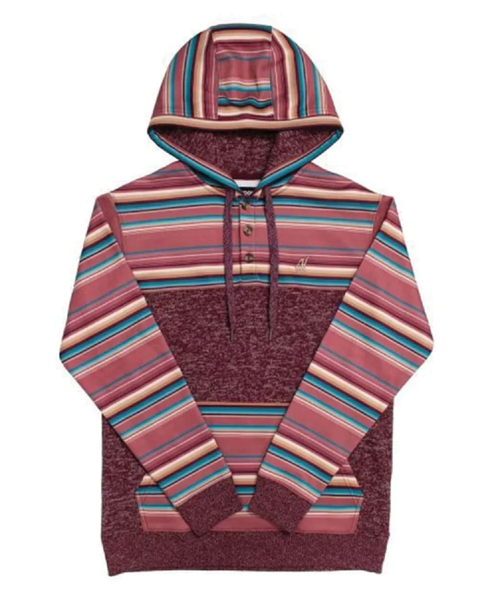 60% Cotton/40% Polyester; Signature Soft Feel; Double Lined Hood; Reinforced Cuffs And Waistband; Custom Braided, Adjustable Draw Cords; Strengthened Kangaroo Pocket; Hidden Phone Pocket; Standard Fit; Three Button Closure; Gold Embroidered Hooey H Logo On Chest; Pink, Blue, Cream, Tan And Purple Serape Print Hood, Sleeves And Pocket; Color: Maroon; Style #HH1202SPMA