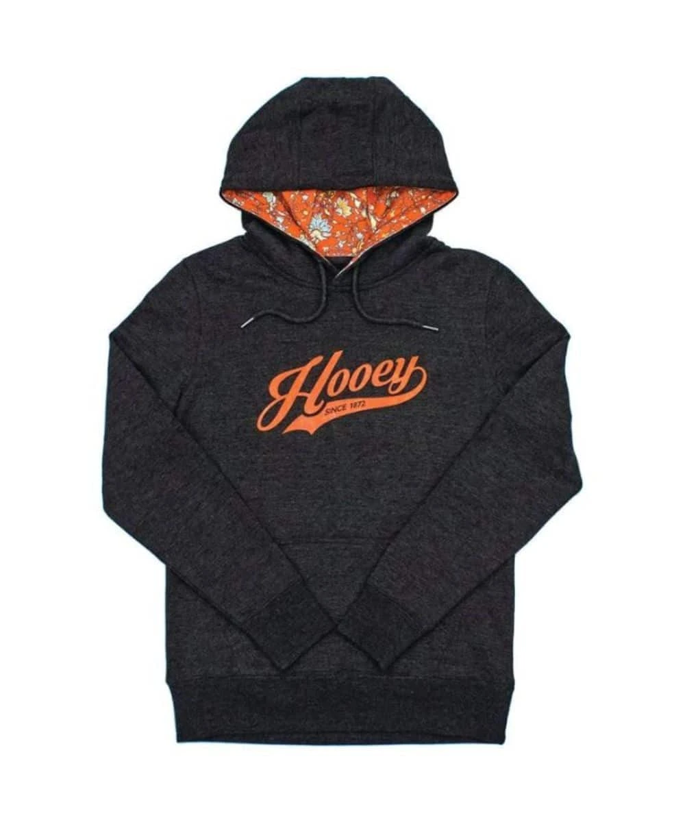 71% Polyester/25% Rayon/4% Elastane; Color: Heather Charcoal; Floral Orange Hood Lining; Orange “Hooey” On Front Center; Signature Soft Feel; Double Lined Hood; Reinforced Cuffs And Waistband; Custom Braided Draw Cords; Strengthened Kangaroo Pocket; Hidden Phone Pocket; Back Yoke Detailing; Standard Fit; Style #HH1196CH