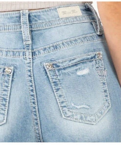 93% Cotton/ 5% Polyester/ 2% Elastane; Color: Dark Wash; 5 Pocket Construction; Mid-Rise; Bootcut; Whiskering; Embroidered Fleur De Lis With Piecing, Studs, And Rhinestone Rivets; Inseam: 34″; Style #M3939B