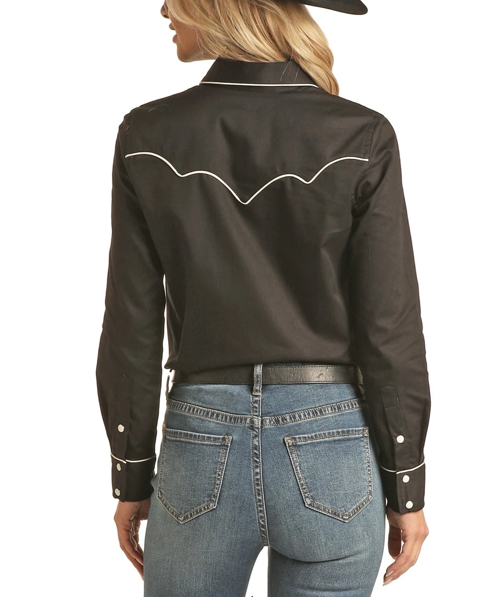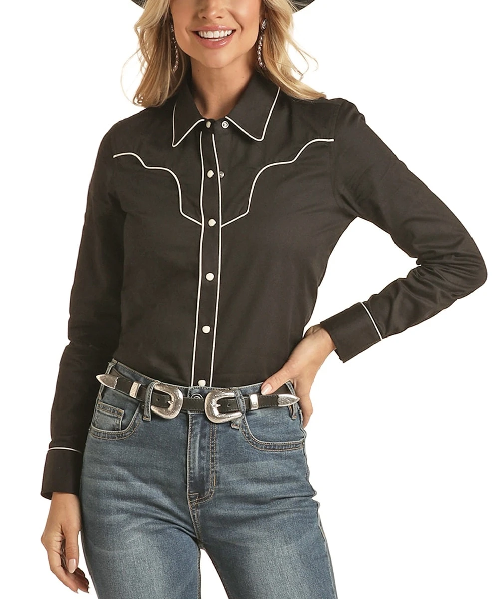 100% Cotton; Spread Collar; Western Front And Back Yokes; White Piping On Collar; Cuffs, Placket And Yokes; Snap Front And Cuffs; White Snap Closures; Color: Black; Style #RRWSOSR0BS