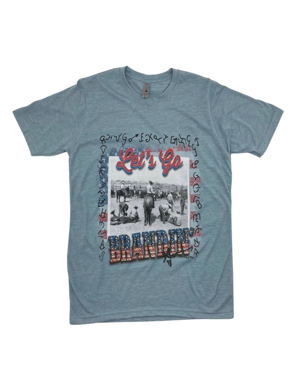 65% Polyester/ 35% Cotton; Color: Dusty Blue; Design Has An American Flag Background Surrounded By Cow Brands; Design Says “Let’s Go Brandin’”; Center Of Design Has Black And White Photo Of Cowboys Branding Cows; Crew Neck; Short Sleeves; Style #LETS GO BRANDIN TEE