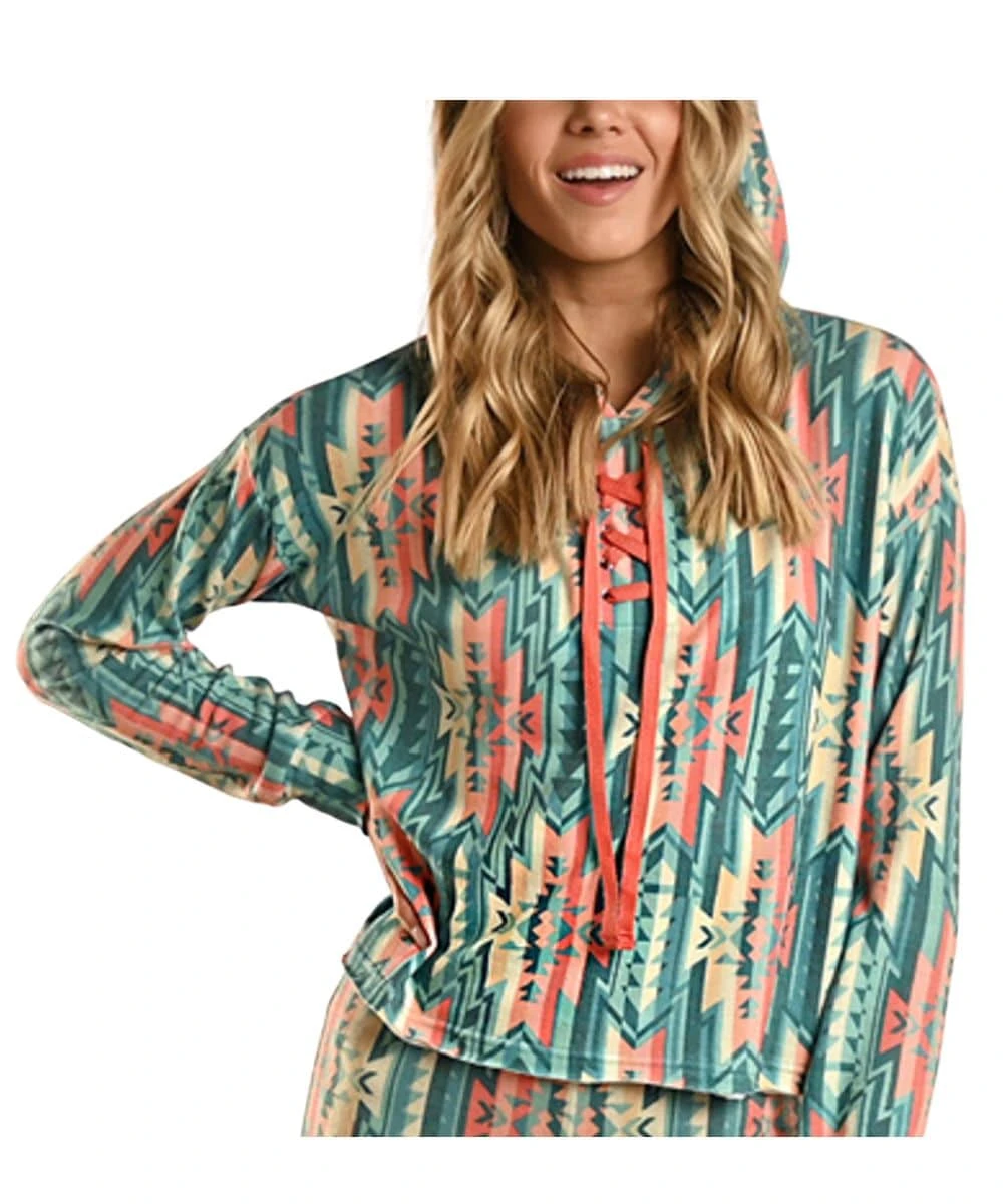 60% Polyester/35% Rayon/5% Spandex; Boxy Fit Hoodie; Long Sleeve; Attached Hood; Front Lace Up Detail; Color: Multicolor Aztec Design; Style #RAWT94R0DF