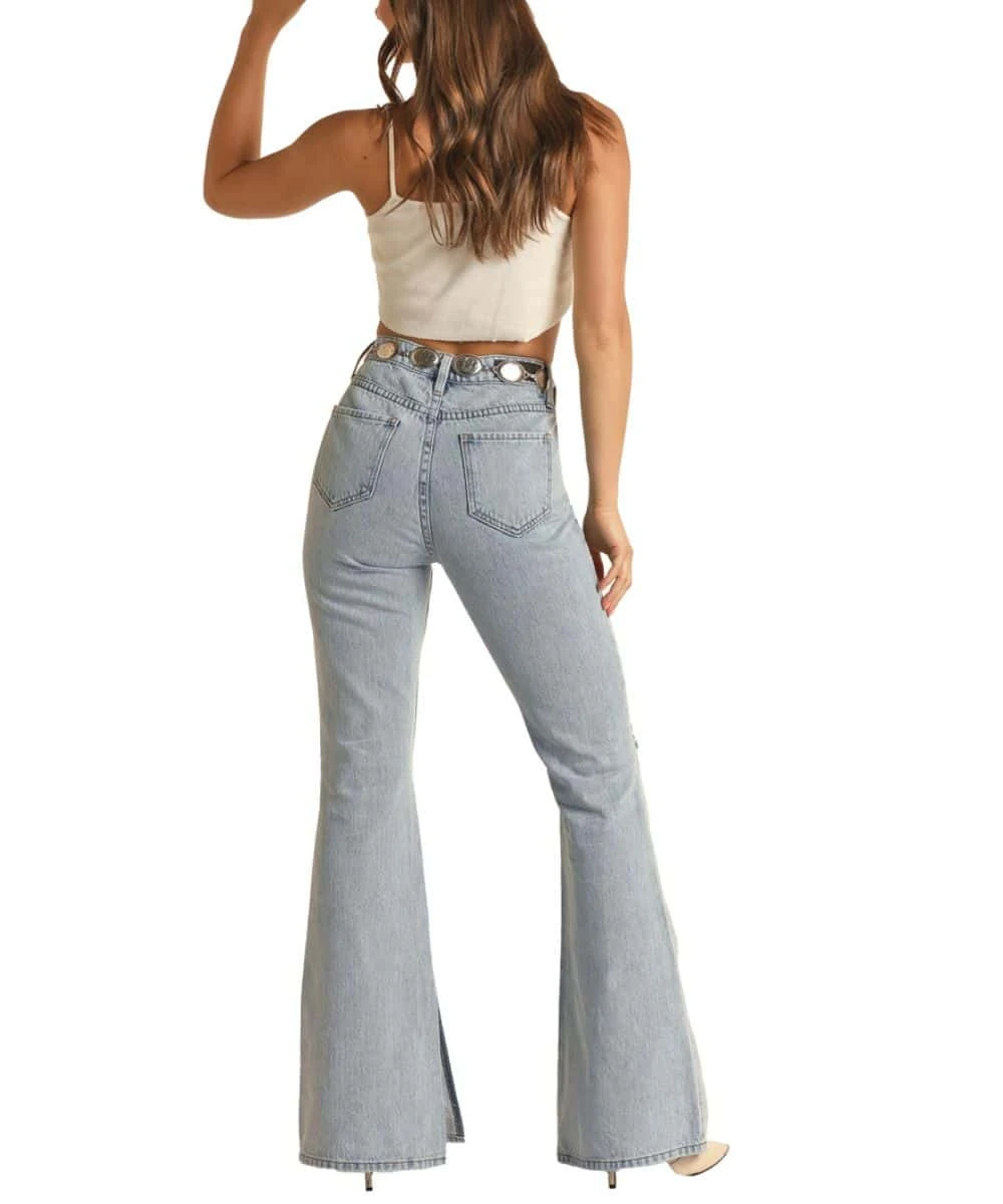 100% Cotton; High Rise; Zip Fly With Button Closure; Five Pocket Styling; Distressed Knee Detailing; Inside Leg Hem Slit; Light Wash; Flare Leg; Style #RRWD6HR14N