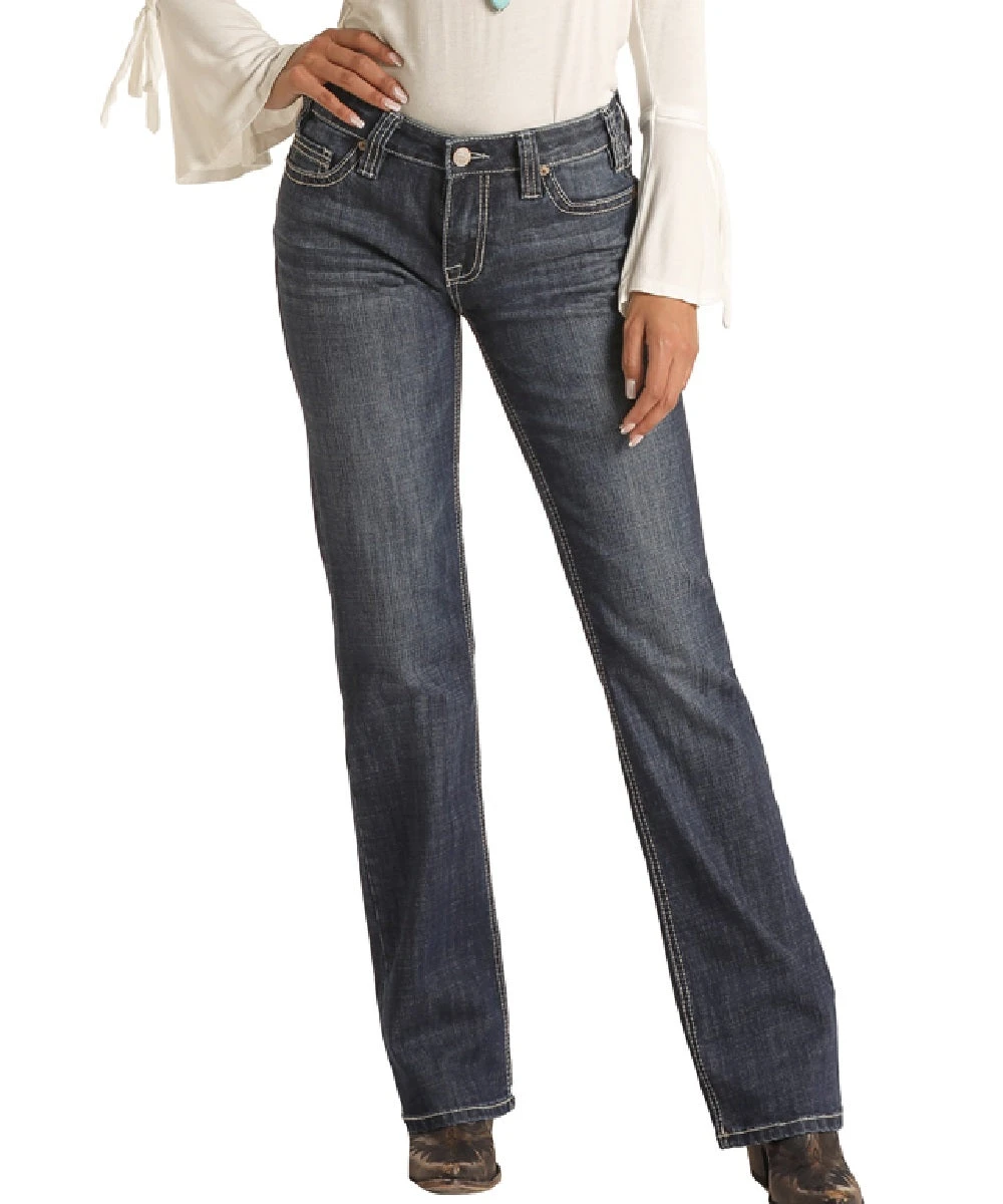 98% Cotton/2% Spandex; Mid Rise; Medium Vintage Wash; Five Pocket Styling; Whiskers; Embroidered Accent Back Pockets; Boot Cut; Style #W1-2704