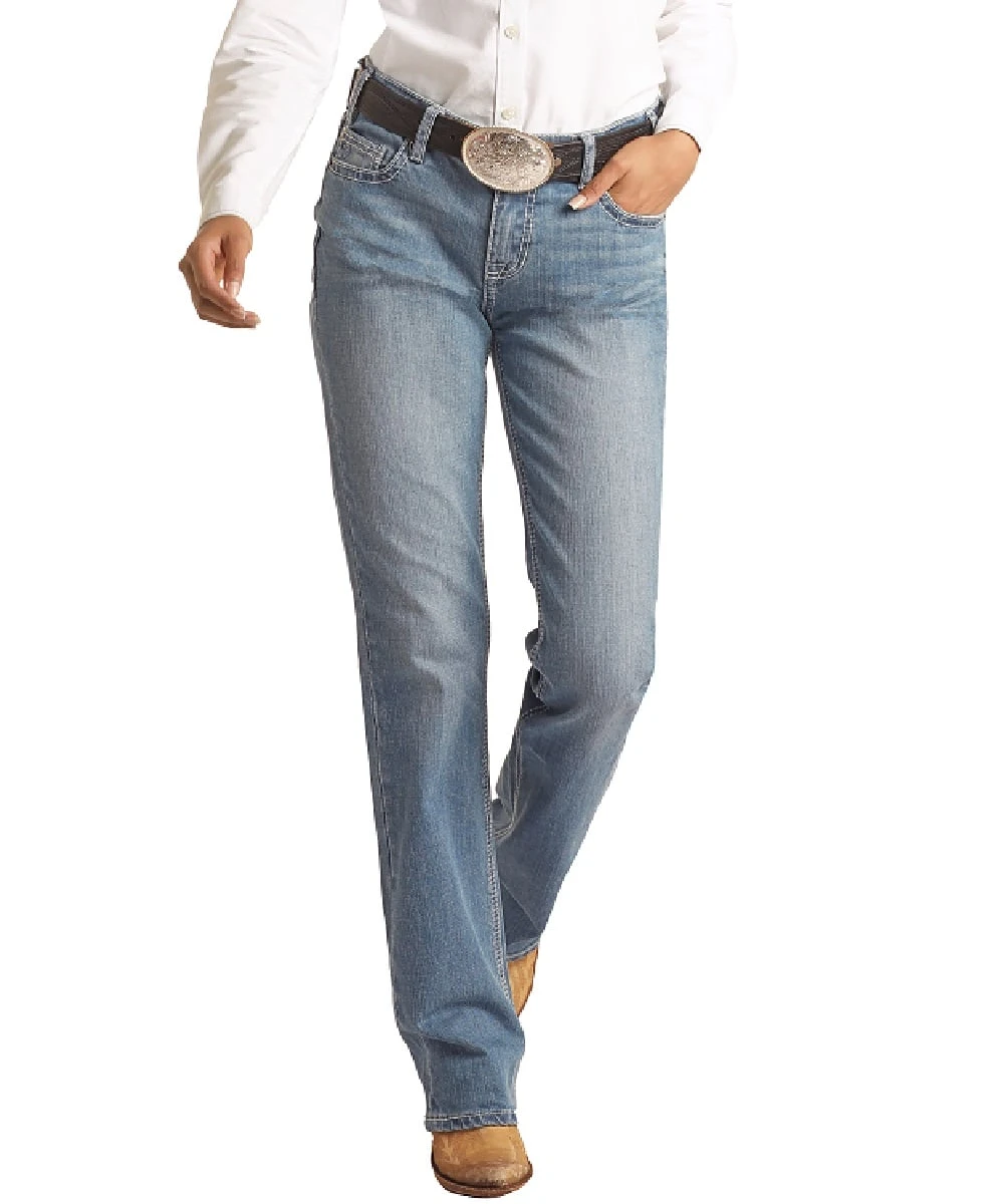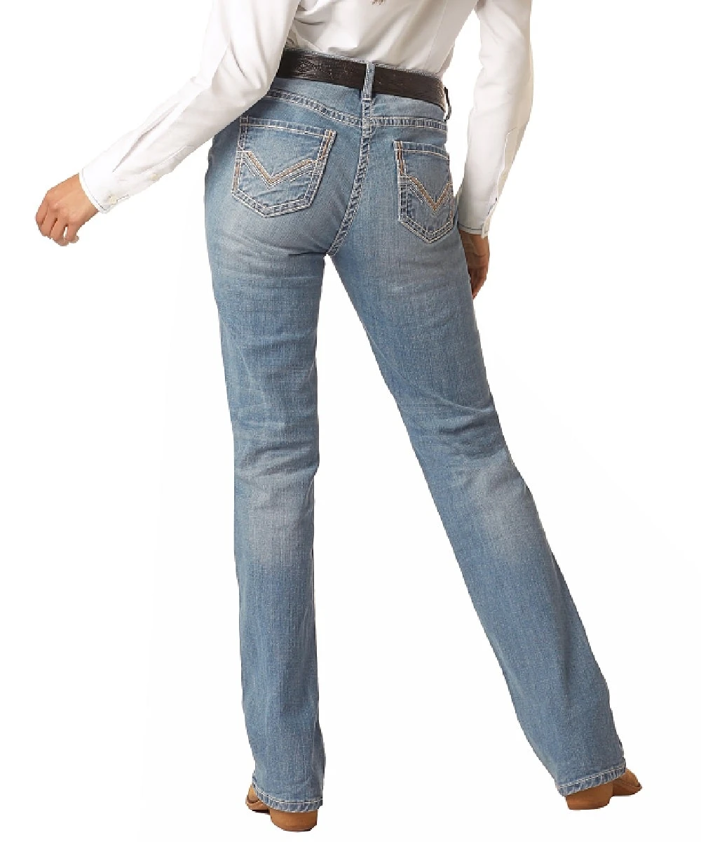 98% Cotton/2% Spandex; Mid Rise; Light Wash; Whiskers; Fading; Sanding; Five Pocket Styling; Ivory And Khaki Embroidered Fashion Back Pockets; Boot Cut; Style #RRWD4RRZT5