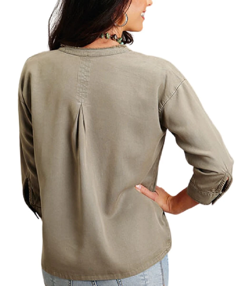 100% Lyocell; V Neck With Raw Edge Collar Treatment; Finished Edge Bottom Hem; Three Quarter Sleeves; Back Center Pleat; Color: Olive; Style #11-050-0565-2015