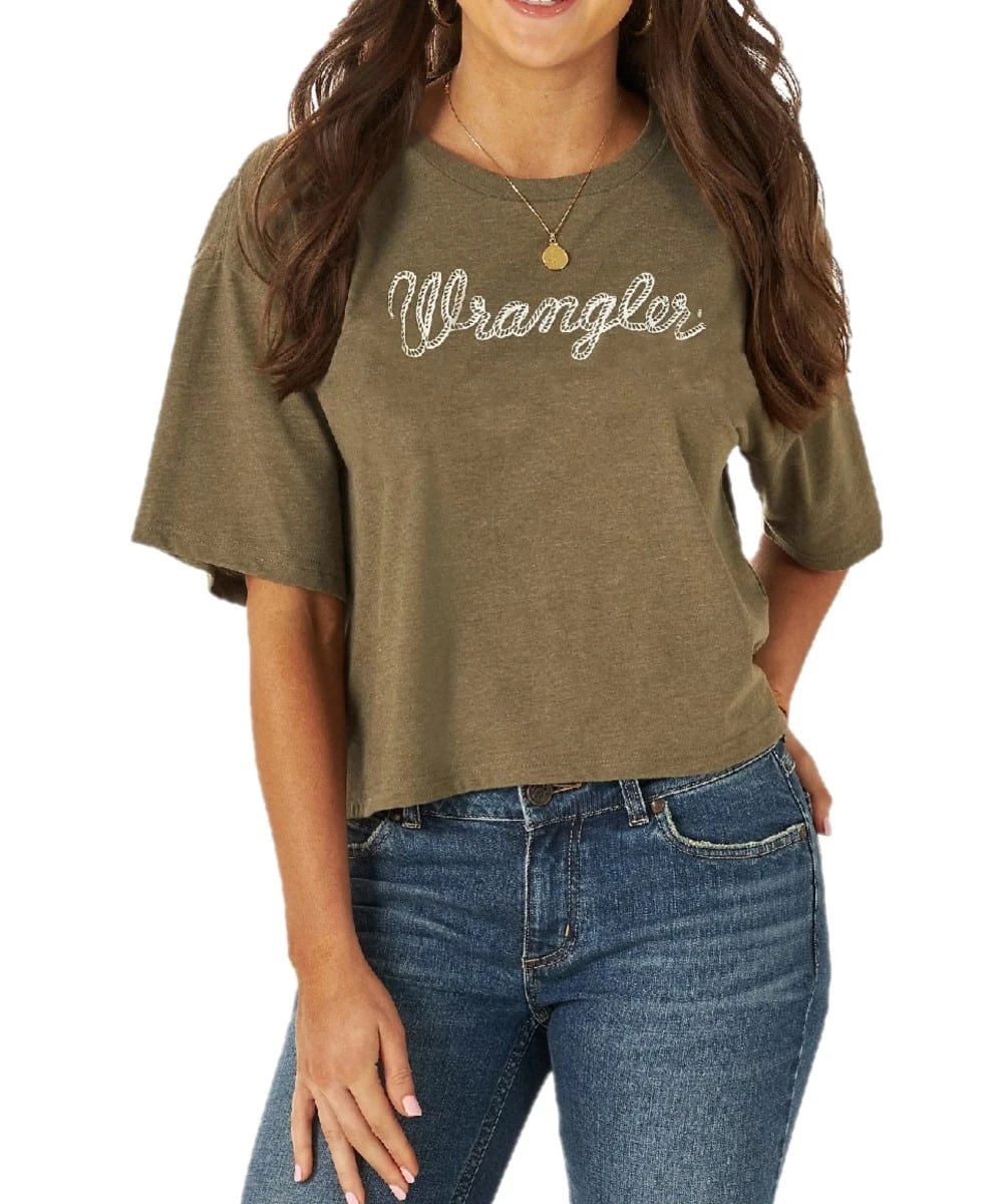 100% Cotton; Cropped Fit; Short Sleeve; Crew Neck; Ribbed Collar; Dropped Shoulders; Rope Design Wrangler Logo On Front; Color: Olive Green; Style #112318822