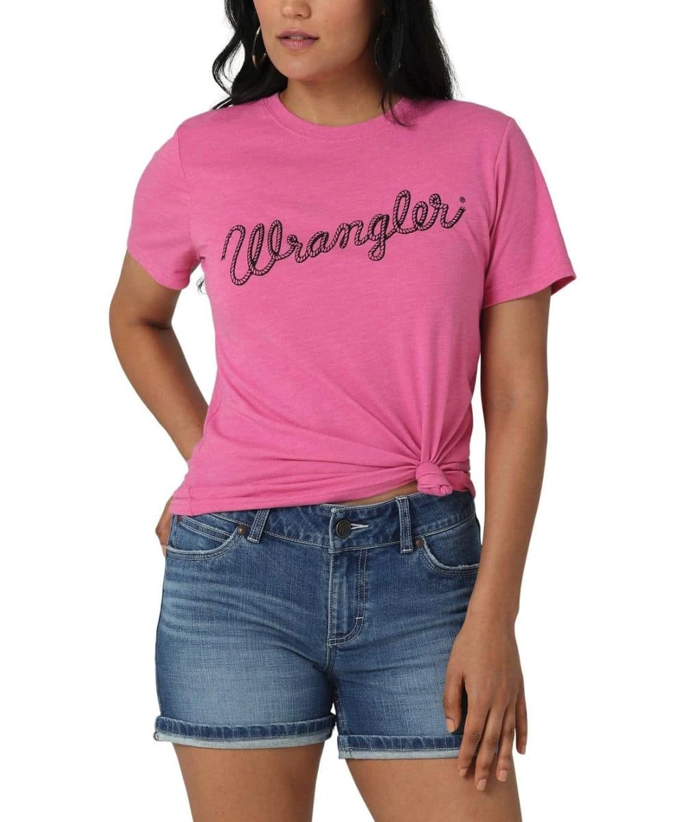 50% Cotton/ 50% Polyester; Color: Ibis Rose; Crew Neck; Short Sleeve; Slim Fit; Design Is Wrangler Rope Logo; Style #112328870
