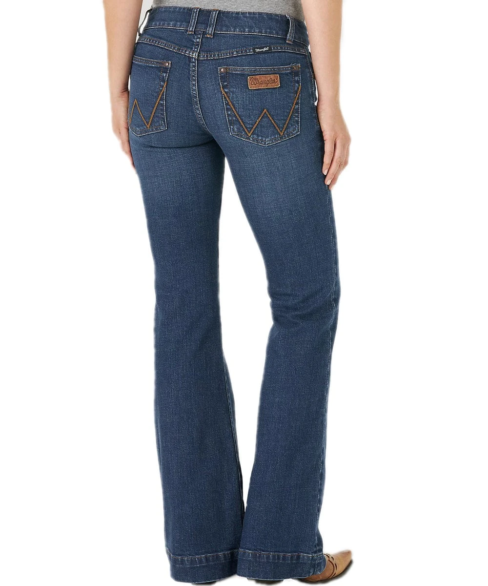 95% Cotton/5% Lycra, 11.25 Oz. Stretch Denim; Mid Rise; Regular Fit; Contour Waist; Five Pocket Styling; Whiskers; Fading; Classic Wrangler โWโ Back Pockets; Wide Leg; Style #09MWWYF