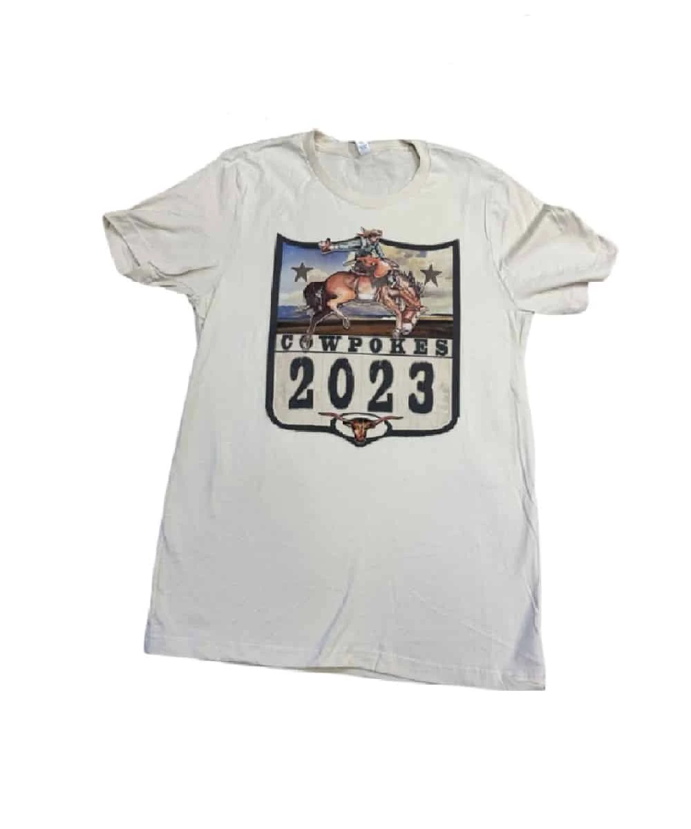 100% Cotton; Short Sleeve; Crew Neck; Front Graphic Buckin’ Bronc Print Reads: Cowpokes 2023; Color: Cream; Style #WESTERN TOILE